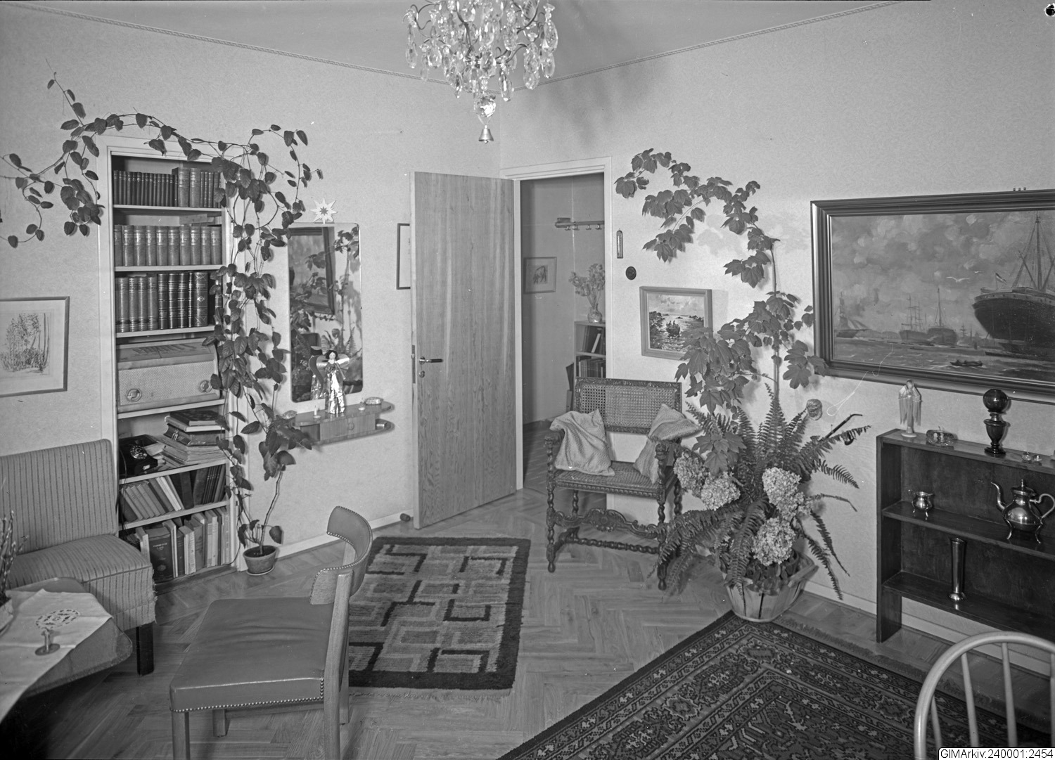 Beskrivning: Förvarad i kuvert med texten: "Heminteriör. Låg löst i asken märkt "Nr. 7318-7402"."