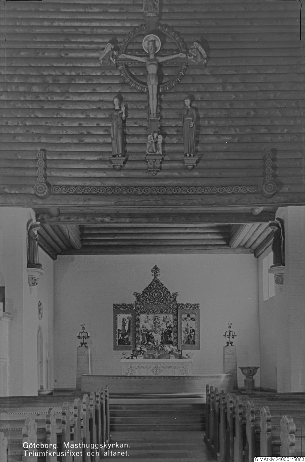 Förvarad i kuvert med texten: "Göteborgs Kyrkor och Kyrkorum. Div. Masthuggskyrkan. Triumfkrucifixet och Altaret"