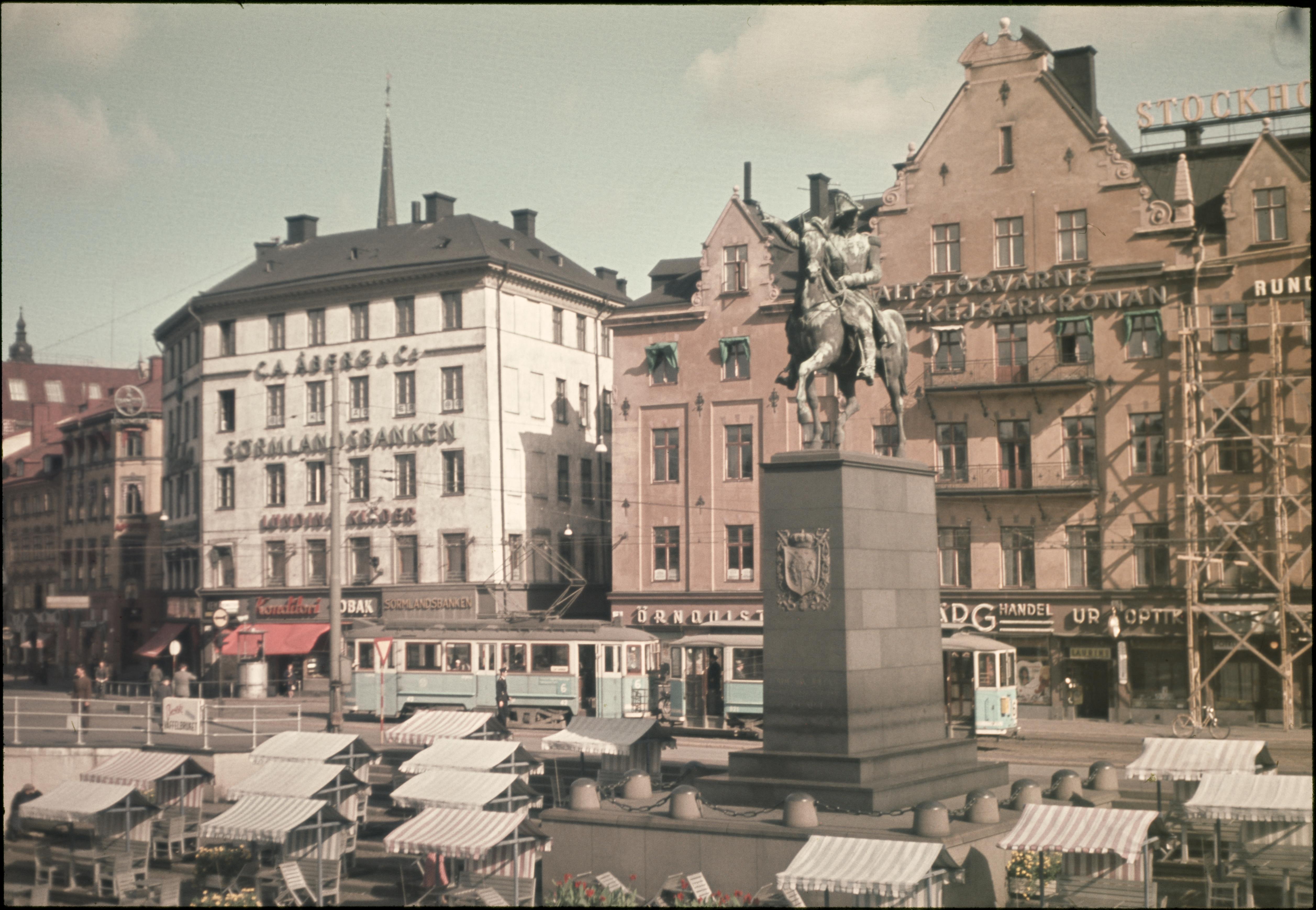 Slussplan mot Gamla stan. I förgrunden Karl XIV Johans staty. Återfotografering år 2010: se bild nr ND31304a. Slussen