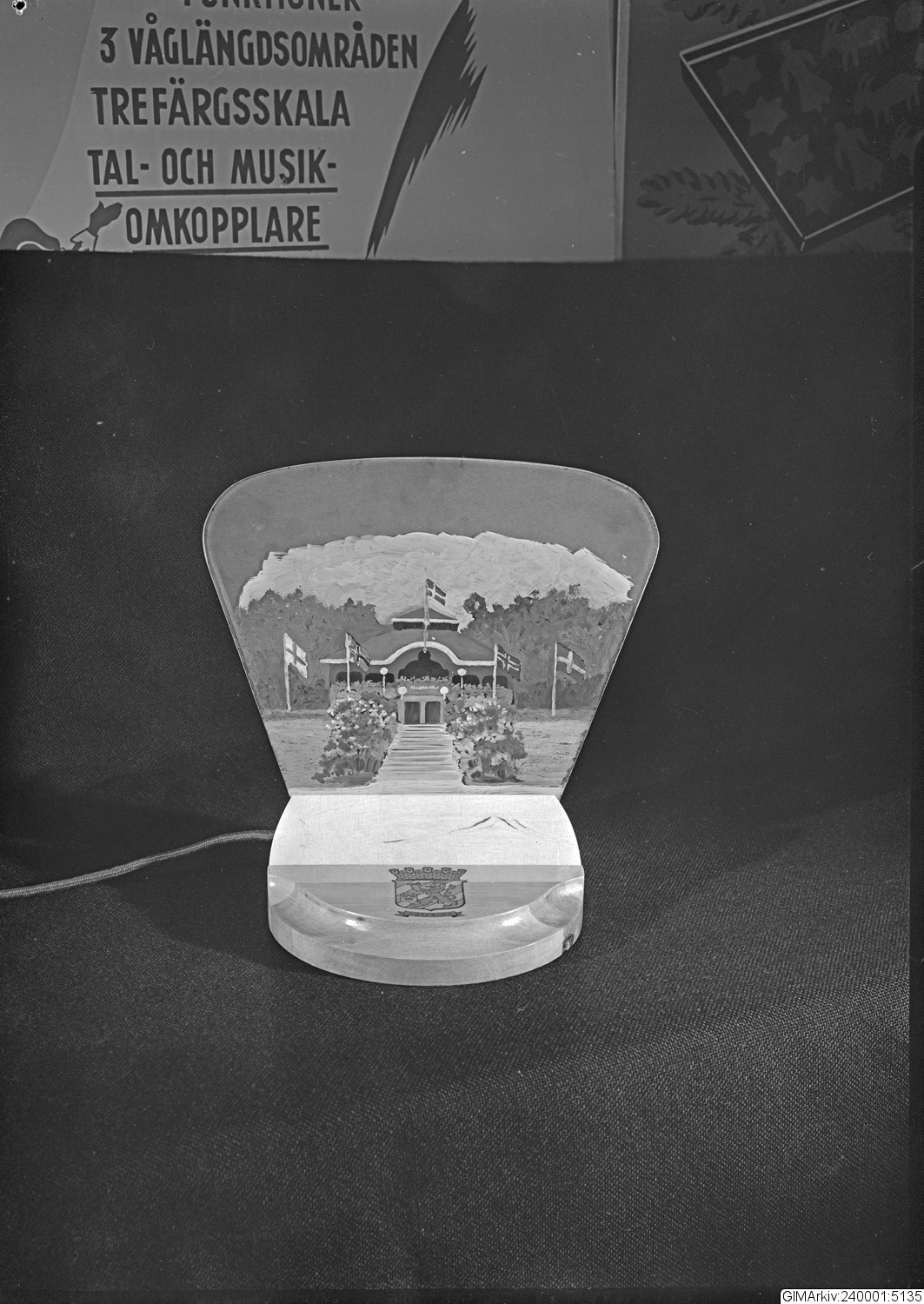 Förvarad i kuvert med texten: "Sten Sjöström. Elansluten prydnad m. nordiska flaggor"