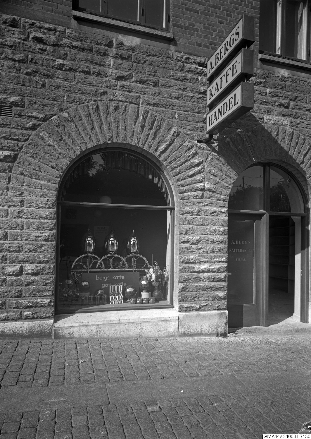 Förvarad i kuvert med texten: "Butik, exteriör, Bergs Kaffe, propaganda för Nationalsocialistiska Arbetarpartiet på en av bilderna så trol. före 1944"