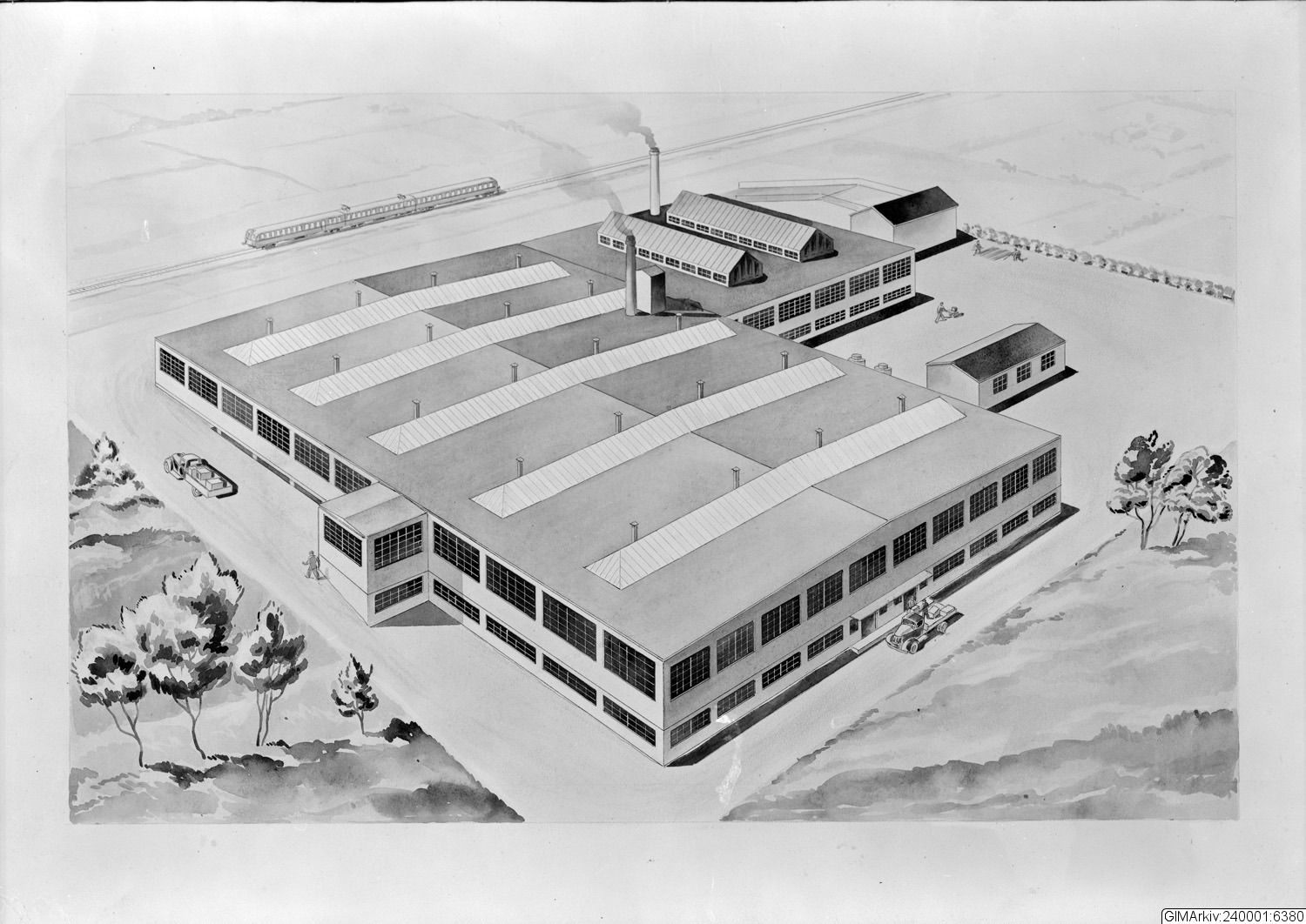 Förvarad i kuvert med texten: "Arkitektritad vy över anläggningen, Sjöberg & Bengtsson"