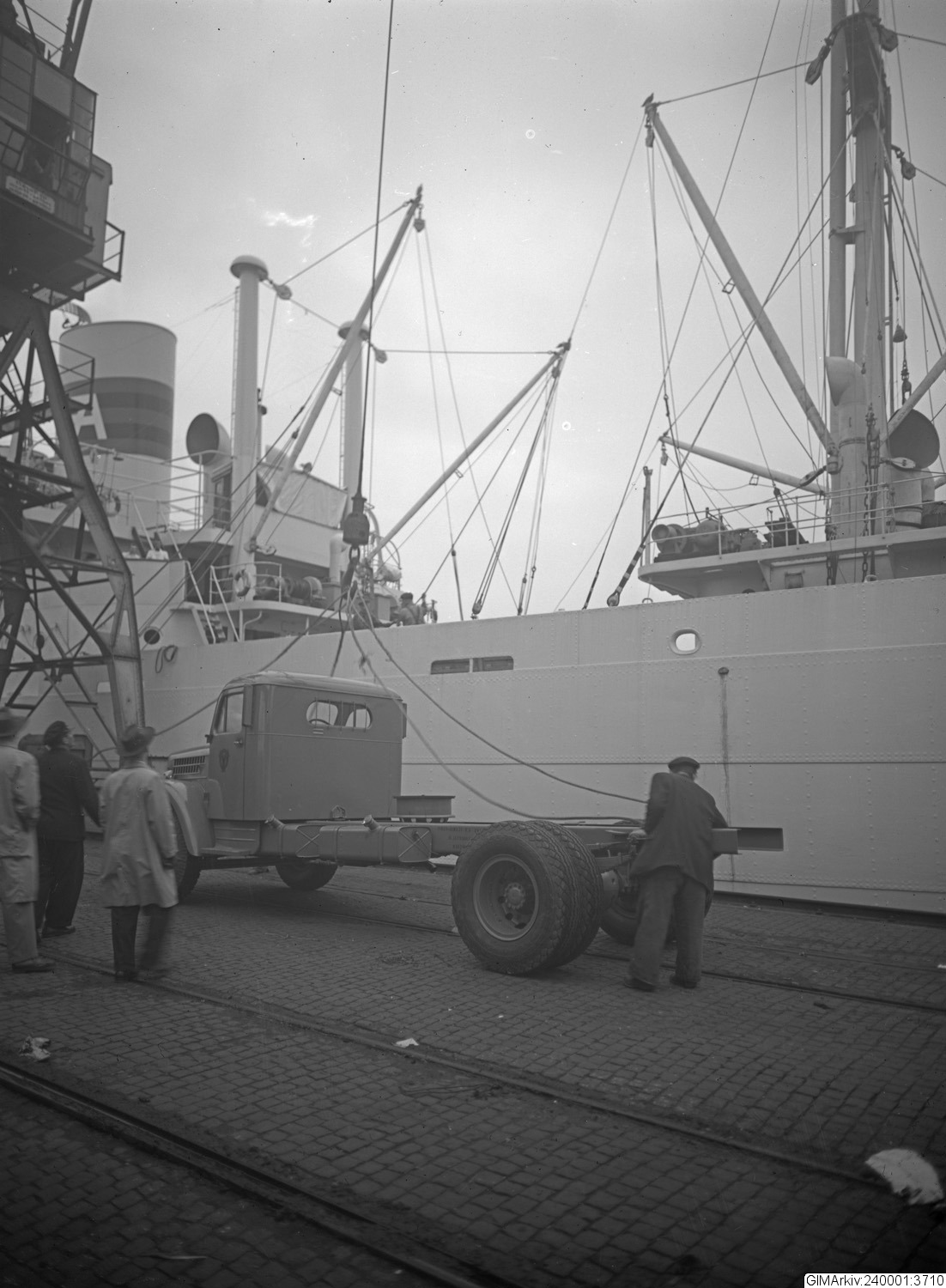 Förvarad i kuvert med texten: "Lastning av lastbil på båt. Scania Vabis. Södertälje"