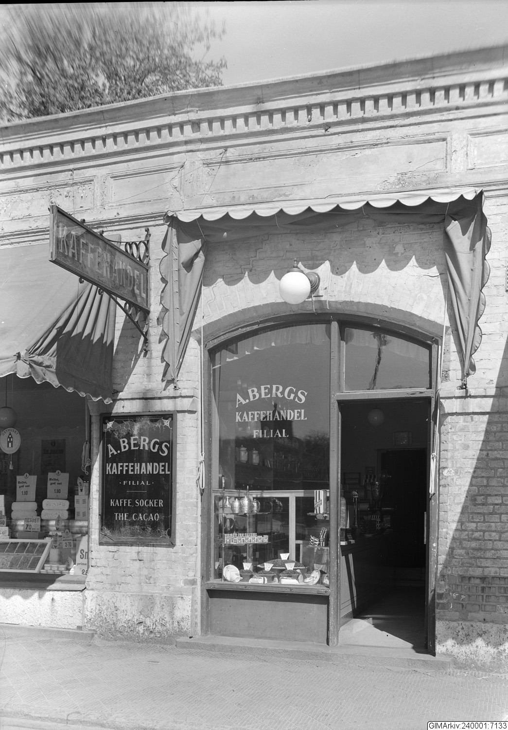 Beskrivning: Förvarad i kuvert med texten: "Butik, exteriör, Bergs Kaffe, propaganda för Nationalsocialistiska Arbetarpartiet på en av bilderna så trol. före 1944"