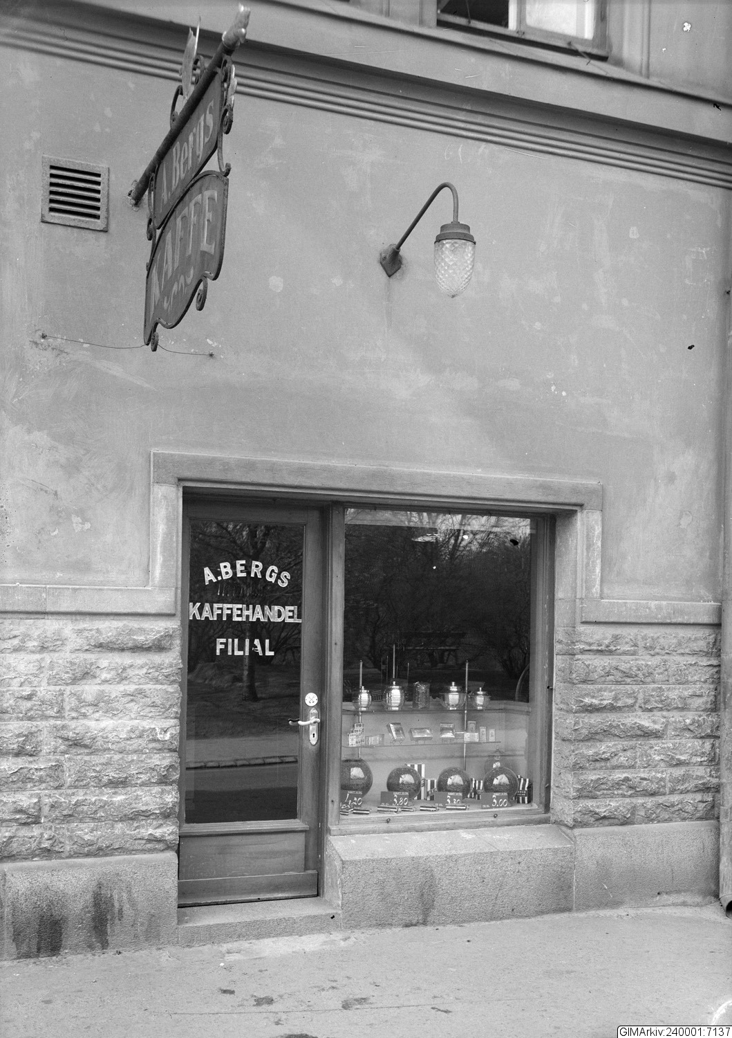 Förvarad i kuvert med texten: "Butik, exteriör, Bergs Kaffe, propaganda för Nationalsocialistiska Arbetarpartiet på en av bilderna så trol. före 1944"
