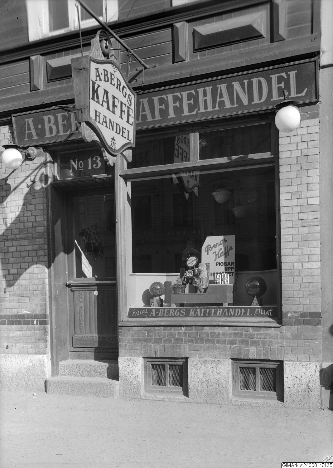 Beskrivning: Förvarad i kuvert med texten: "Butik, exteriör, Bergs Kaffe, propaganda för Nationalsocialistiska Arbetarpartiet på en av bilderna så trol. före 1944"