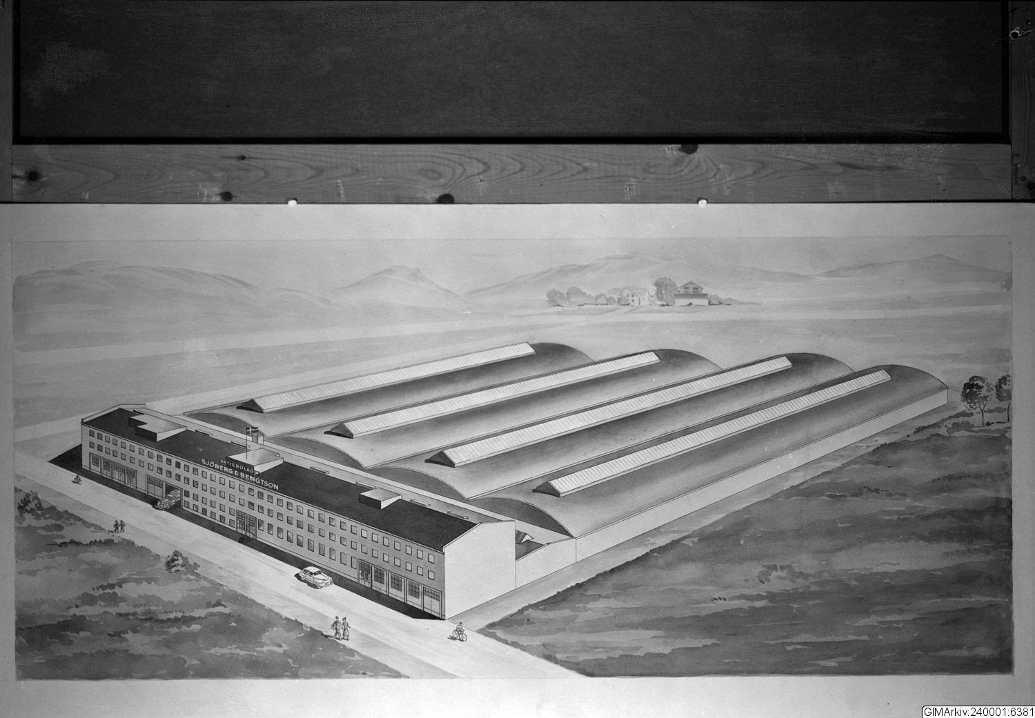 Förvarad i kuvert med texten: "Arkitektritad vy över anläggningen, Sjöberg & Bengtsson"