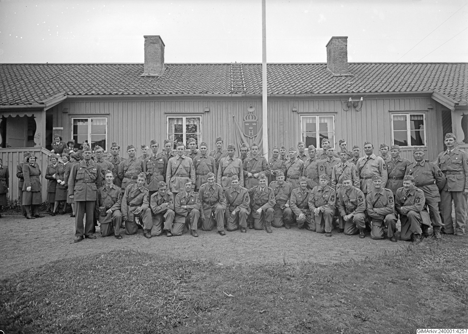 Förvarad i kuvert med texten: "V. Hemvärnet. Herrarna och damer på gården. 1945"