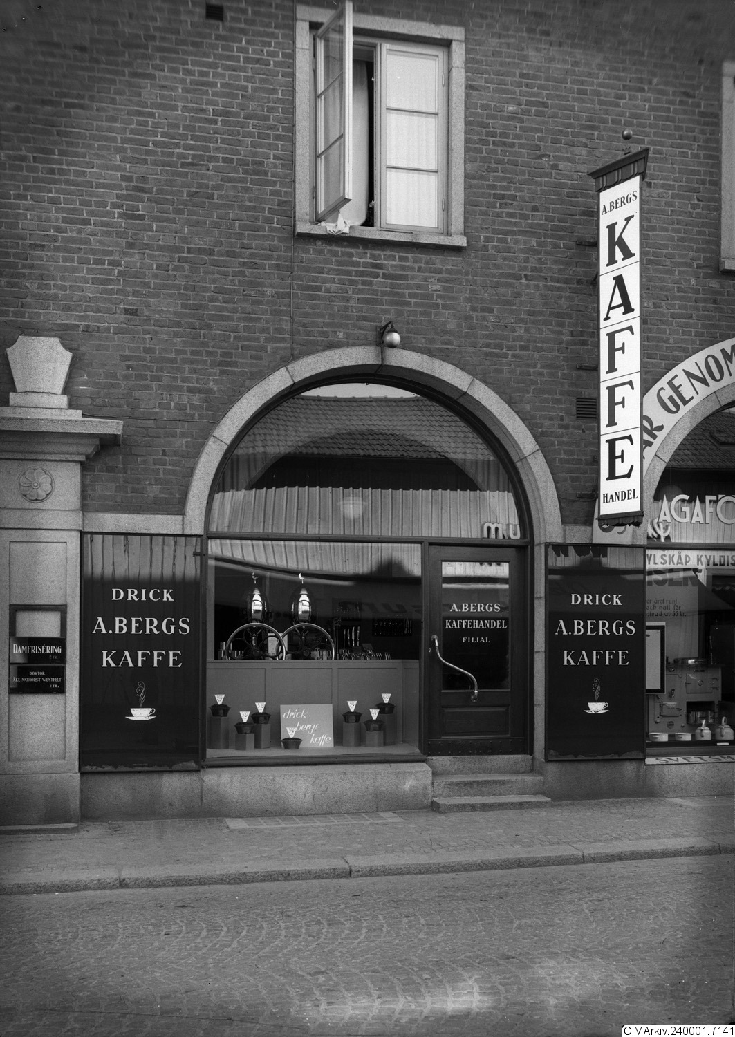 Beskrivning: Förvarad i kuvert med texten: "Butik, exteriör, Bergs Kaffe, propaganda för Nationalsocialistiska Arbetarpartiet på en av bilderna så trol. före 1944"