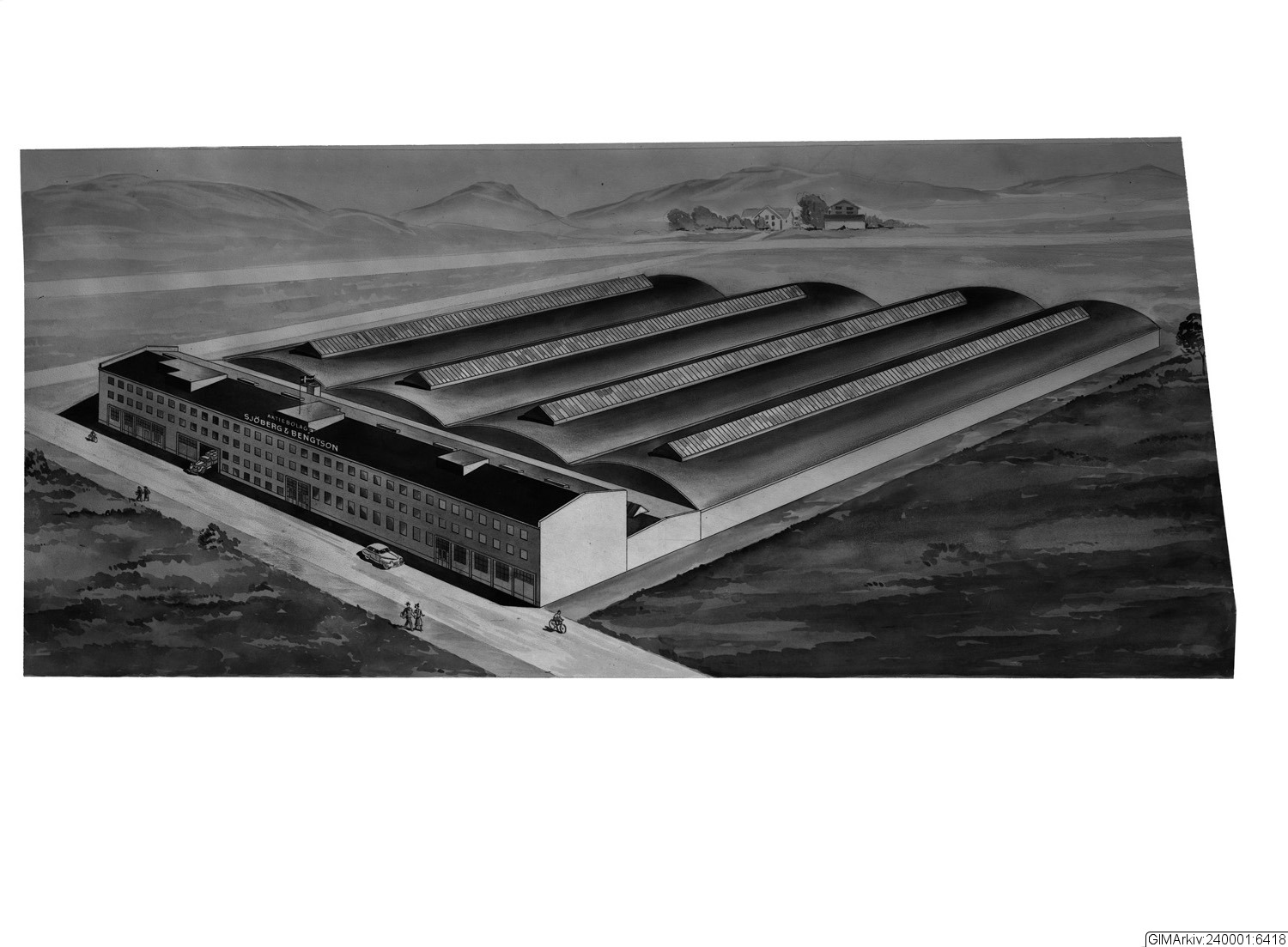 Förvarad i kuvert med texten: "Arkitektritad vy över anläggningen, Sjöberg & Bengtsson"