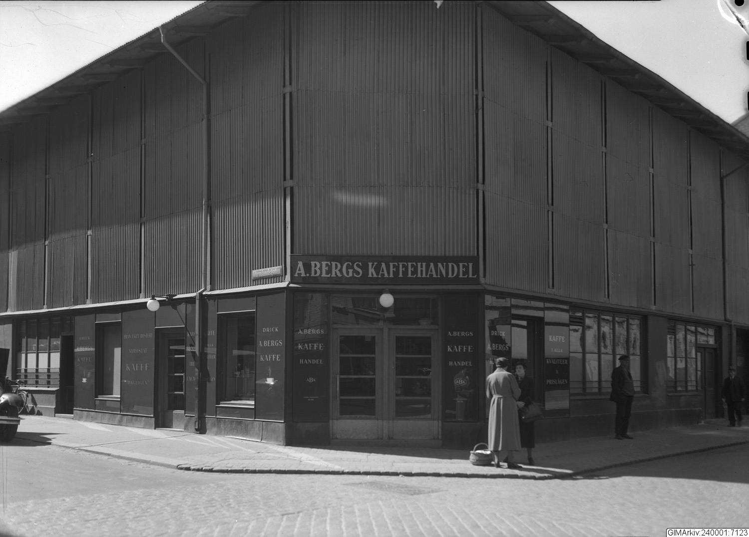 Förvarad i kuvert med texten: "Butik, exteriör, Värmlandsgatan, Bergs Kaffe, propaganda för Nationalsocialistiska Arbetarpartiet på en av bilderna så trol. före 1944"