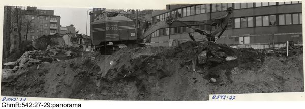 Nv hörnet av husgrunden under bortgrävning. Skärning i SV-NÖ genom området V om husgrunden. Från SÖ. I bakgrunden t.v syns huset Övre Kyrkogatan 1 under ett temporärt uppehåll i flyttningsarbetet.