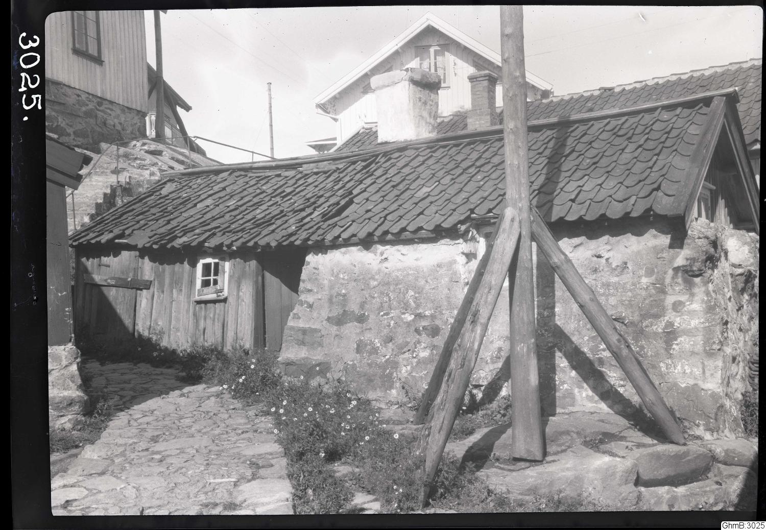 Svartvitt foto. Stenstugan