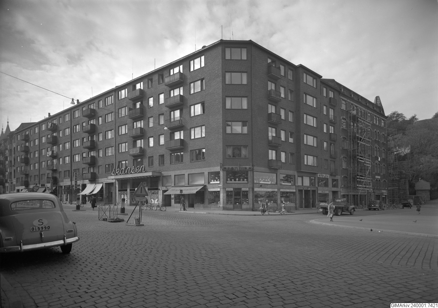 Förvarad i kuvert med texten: "Stadsmiljö, Dir. Bror Albrecktson, bl.a Sten Sturegatan, Engelbrektsgatan, Övre Husargatan, Skanstorget"