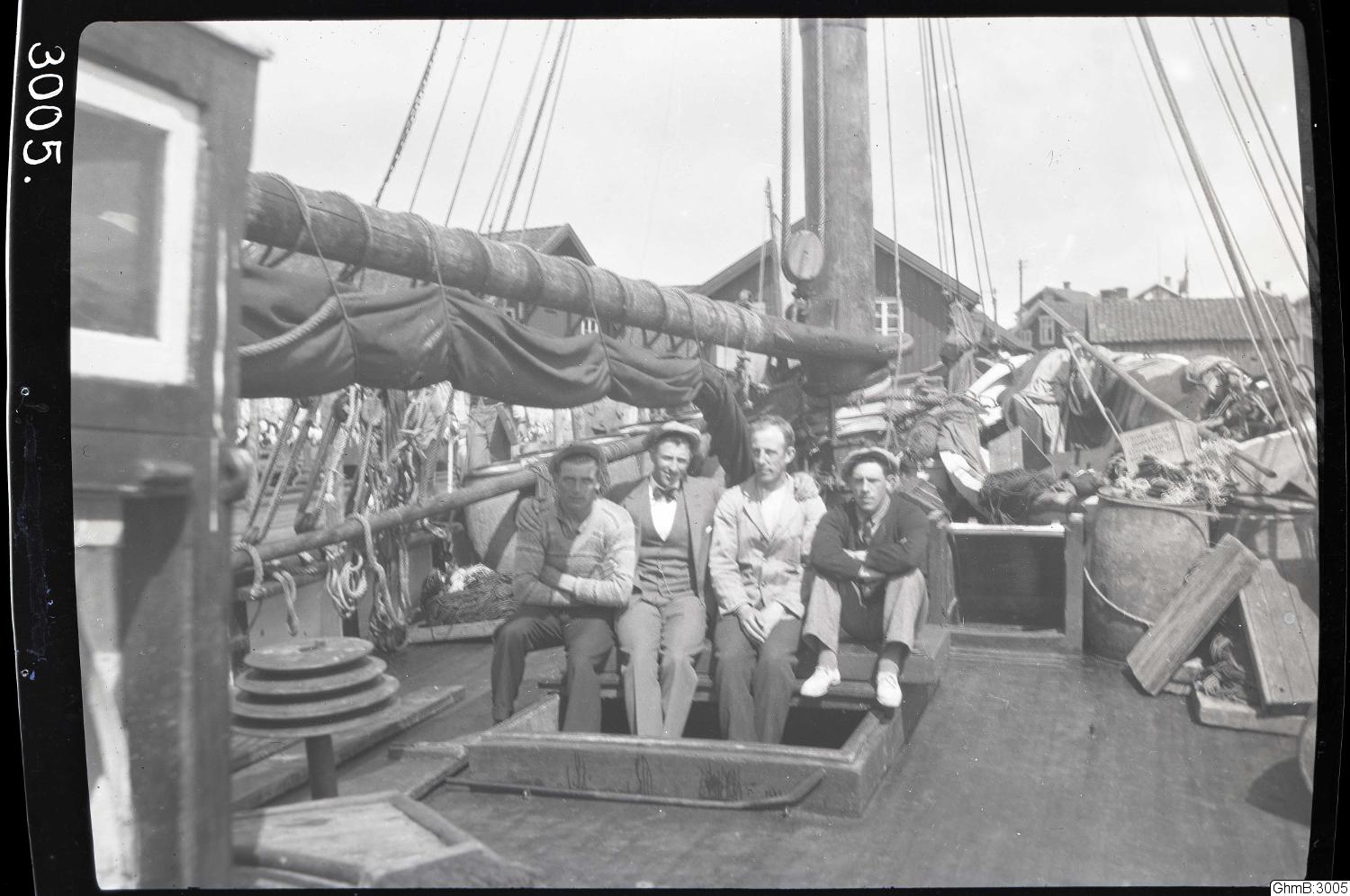 Svartvitt foto. Motorbåt rustad för storsjöfiske