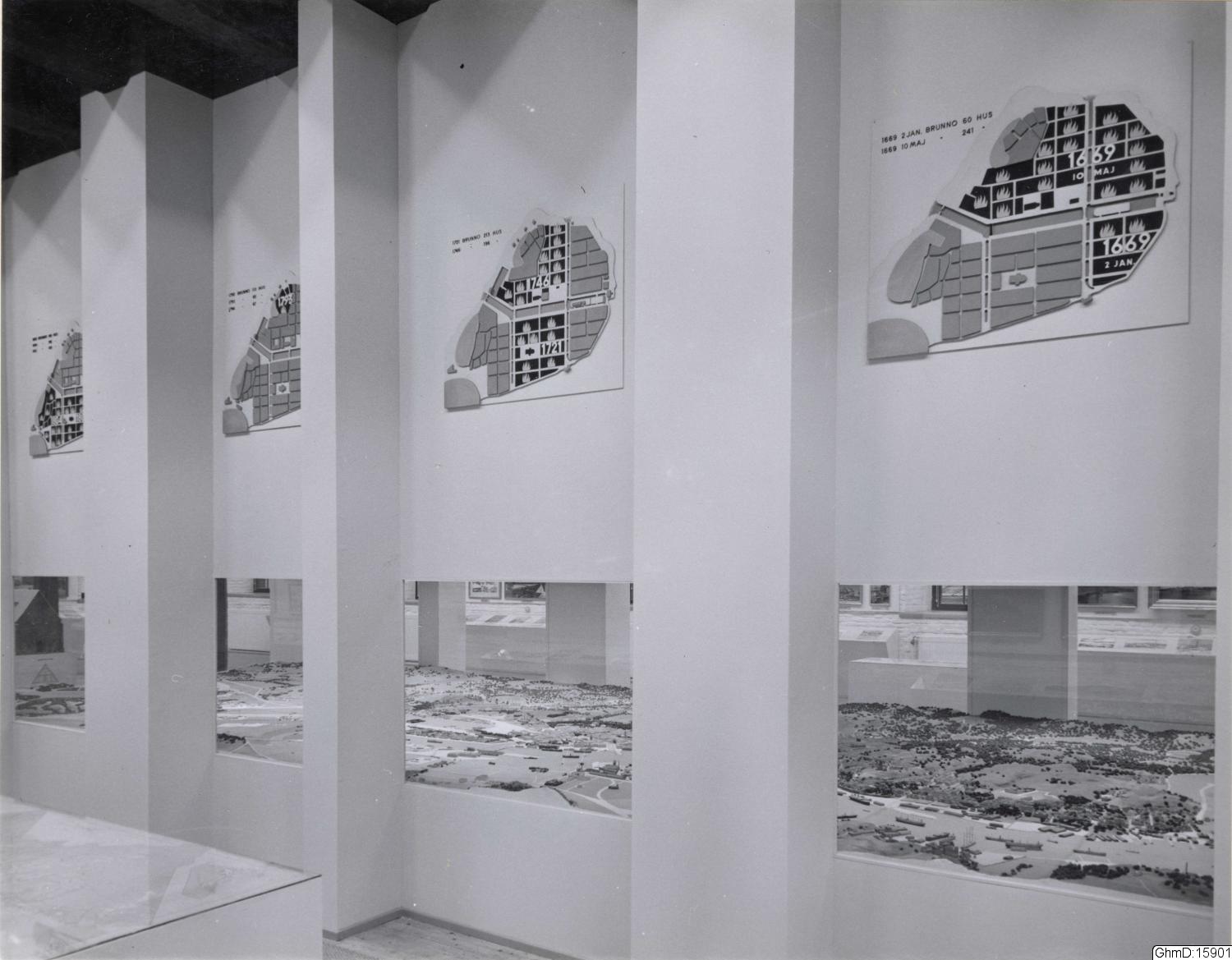Svartvitt foto, Göteborgsmodellen från 1923. På väggen brandkartor i färg, utförda av konstnär Åke Brovik, Göteborgstopografiska samlingarna. Göteborgs Museum, Kronhuset.