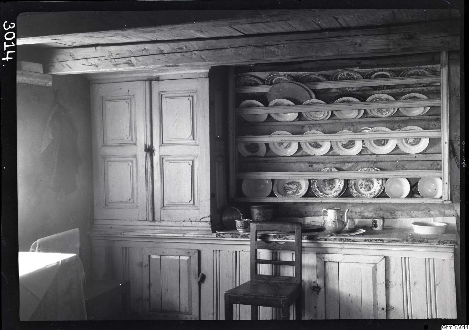 Svartvitt foto. Stuga interiör av kök med talrikshylla
