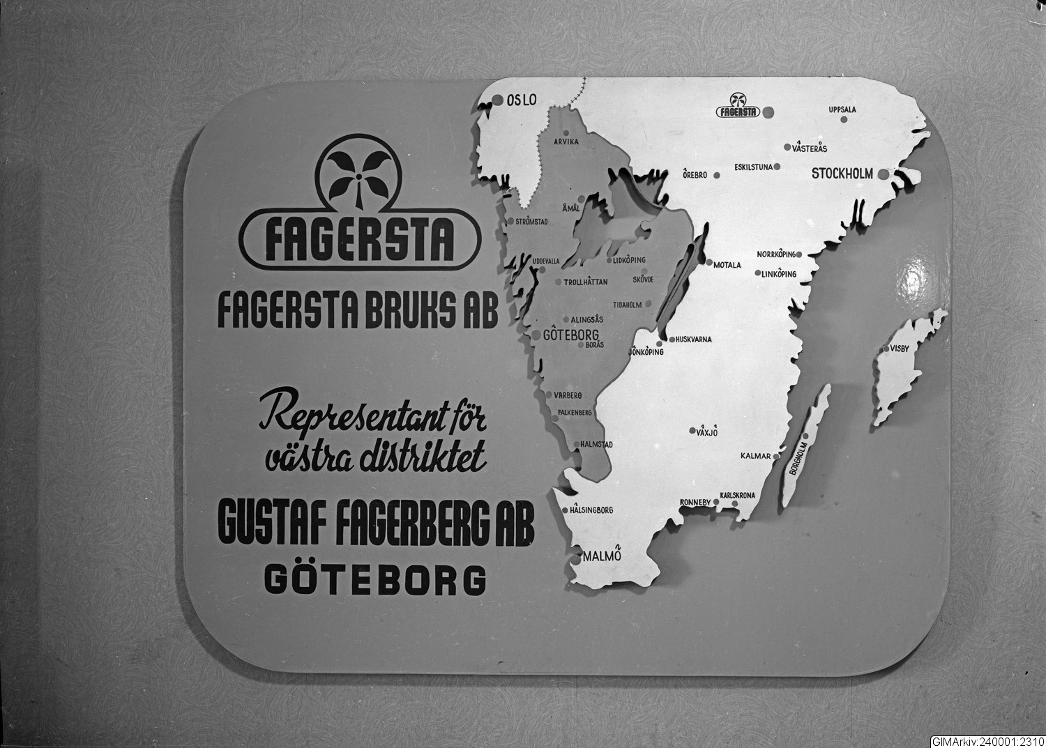 Förvarad i kuvert med texten: "Kontor. Kronhusg. Gust. Fagerberg. Juli-49. Info: Gustaf Fagerberg AB. represtentant Fagersta Bruks AB. Står på kuvert: reklamskylt m. karta."