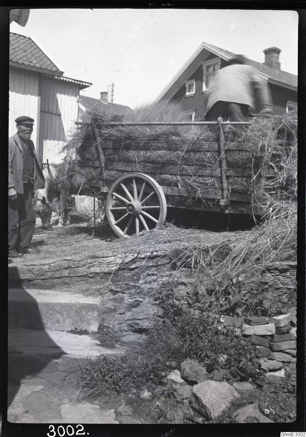 Svartvitt foto. Höet köres hem till ladan hos Olle Johansson