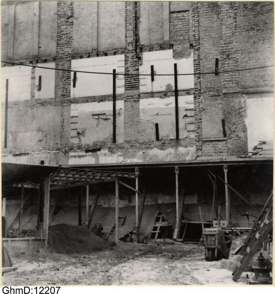 Rivnings- och grävningsarbeten för nybyggnad jan. 1954. Fyndplats för lerkärlsfragment GM:20568.