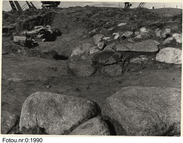 Ingången i östra vallen med norra muren till höger, i förgrunden södra muren. Till vänster i bakgrunden syns husgrundens östra vägg. Från sydöst.