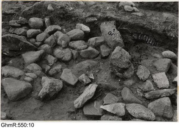 Undersökningen av Arendals redutt, sept. 1972. Konstruktionen 1 i husgrunden. Till vänster om stenen a1 har andra stenlagret rensats fram, till höger ligger första stenlagret kvar. Plankans läge har markerats, liksom den grå hårda lerlinsen i profilen. Från sydsydöst.