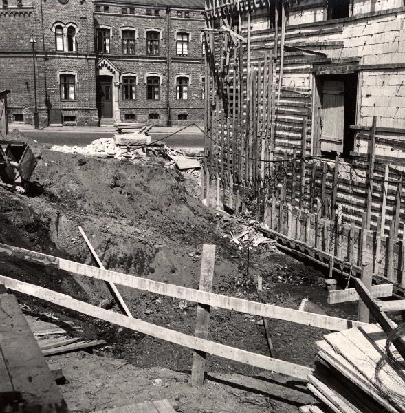 Vattenledningsresterna utgjordes av två utborrade trästammar i SSV-NNO riktning. Riktningen markerad med bommen i bildens mitt.