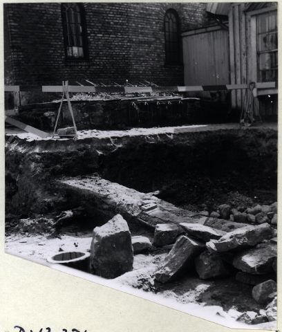 Vid omläggning av trottoar utanför Trädgårdshallen blottades delar av gammal vattenledning av trä. Ledningarna har tagits om hand av Vattenverkets museum. Fyndplats och sektion inmätta å uppmätning av den 22.6 1955, gjord av A.N. och L.A.-N.