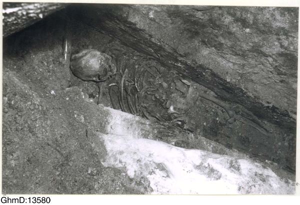 Rester av skelett och kistdelar blottade i Kronhusets västparti den 19 november 1955 i samband med grundgrävning för blivande sanitära anläggningar. -Skeletten härröra från begravningar i kyrkogården vid Kvarnbergets fot, sannolikt mellan 1621-1643. -Fynden ha inmätts av arkitekten E.G. Karlgren likaledes den 19 november 1955. -Skelettdelarna tillvaratogs pietetsfullt, lades ned i för tillfället tillverkade lådor, som kommer att nedsättas på Kristine kyrkogård.
