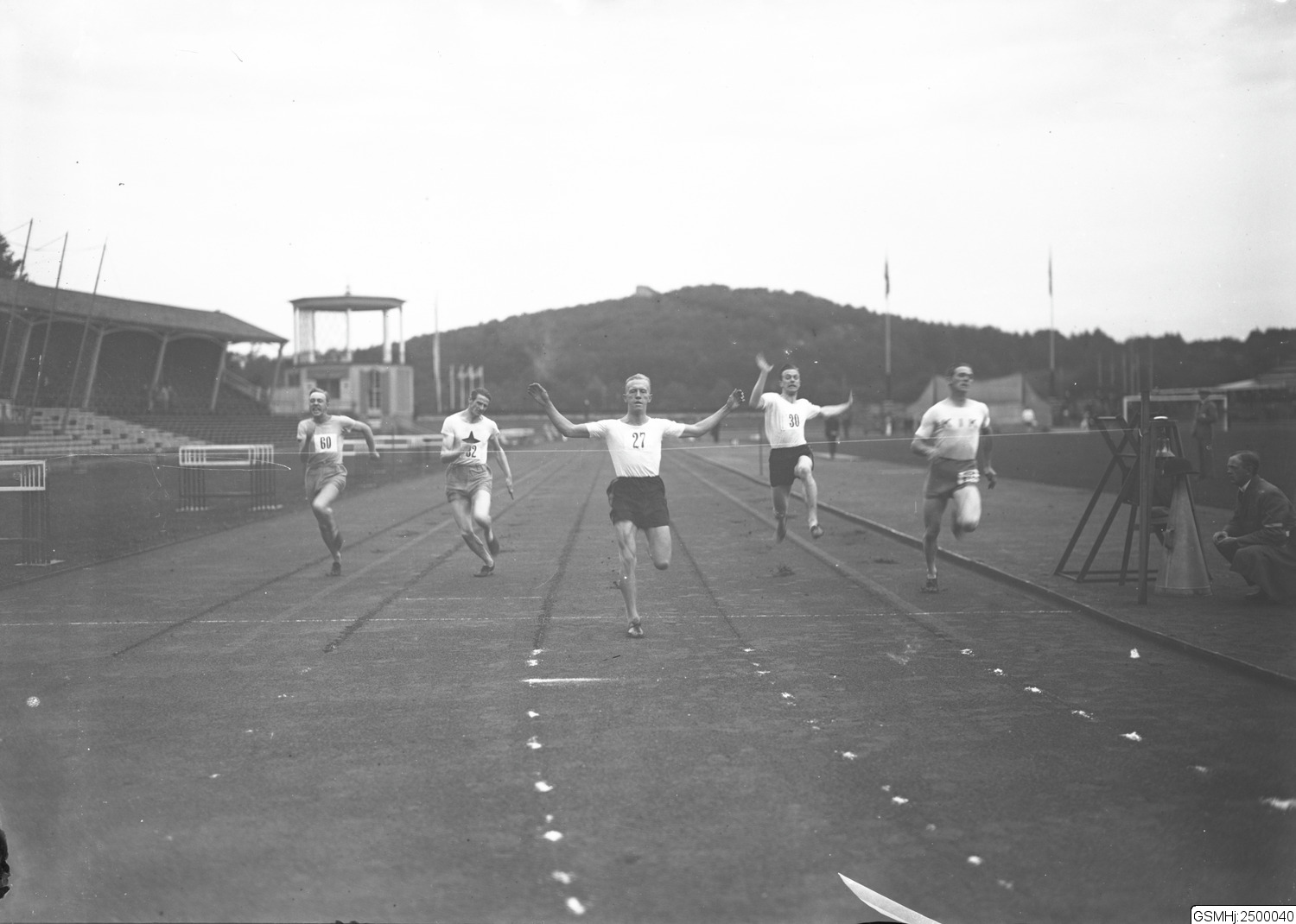 Här ser vi ett av försöksheaten på 100 yards under tävlingarna på Slottsskogsvallen den 25 augusti 1925. Det var C. Medberg som var först över mållinjen. Artikeln noterade också att publiken var förvånansvärd liten denna dag, trots att några av landets främsta idrottare deltog, och att tävlingarna också gästades av amerikanska idrottsstjärnor. Skribenten spekulerade i om den kraftiga regnskuren strax innan start hade avskräckt folk. Den mest imponerande insatsen kom från amerikanen Harold Osborn, olympisk guldmedaljör från Paris 1924, som nästan satte ett världsrekord med ett hopp över 2 m i höjdhopp. Osborn hade året vunnit guld i höjdhopp i Paris med ett hopp på 1,98 meter, och han tog även ett guld i tiokamp vid samma OS.