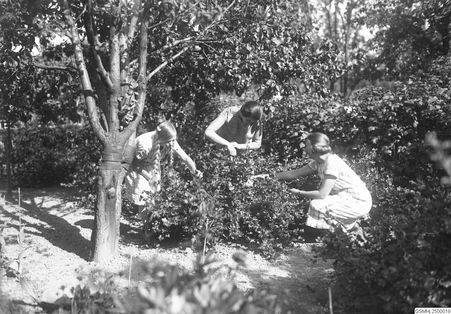 Flickor som plockar krusbär i en koloniträdgård, sannolikt Burgårdskolonin. I Göteborgs-Tidningen den 25 juni 1925 kunde läsaren ta del av rubriken ”Odlaren får lön för mödan”. Där stod det: ”Det är roligt att träffa på glada och förnöjsamma människor. Var kan man göra sådana fynd frågar pessimisten! Vi måste ju medge att det är litet ovanligt, ty i regel består människosläktet av missnöjda individer, som gå omkring och se sura ut.” Så var det dock inte i stadens koloniträdgårdar, där sommarglädjen frodas. Här fick stadsborna en chans att odla, umgås och njuta av sina små paradis. Burgårdskolonin var Göteborgs första koloniområde som började anläggas sommaren 1905 och stod klar på våren 1906. 1956 avröjdes området för att ge plats åt Valhallabadet.