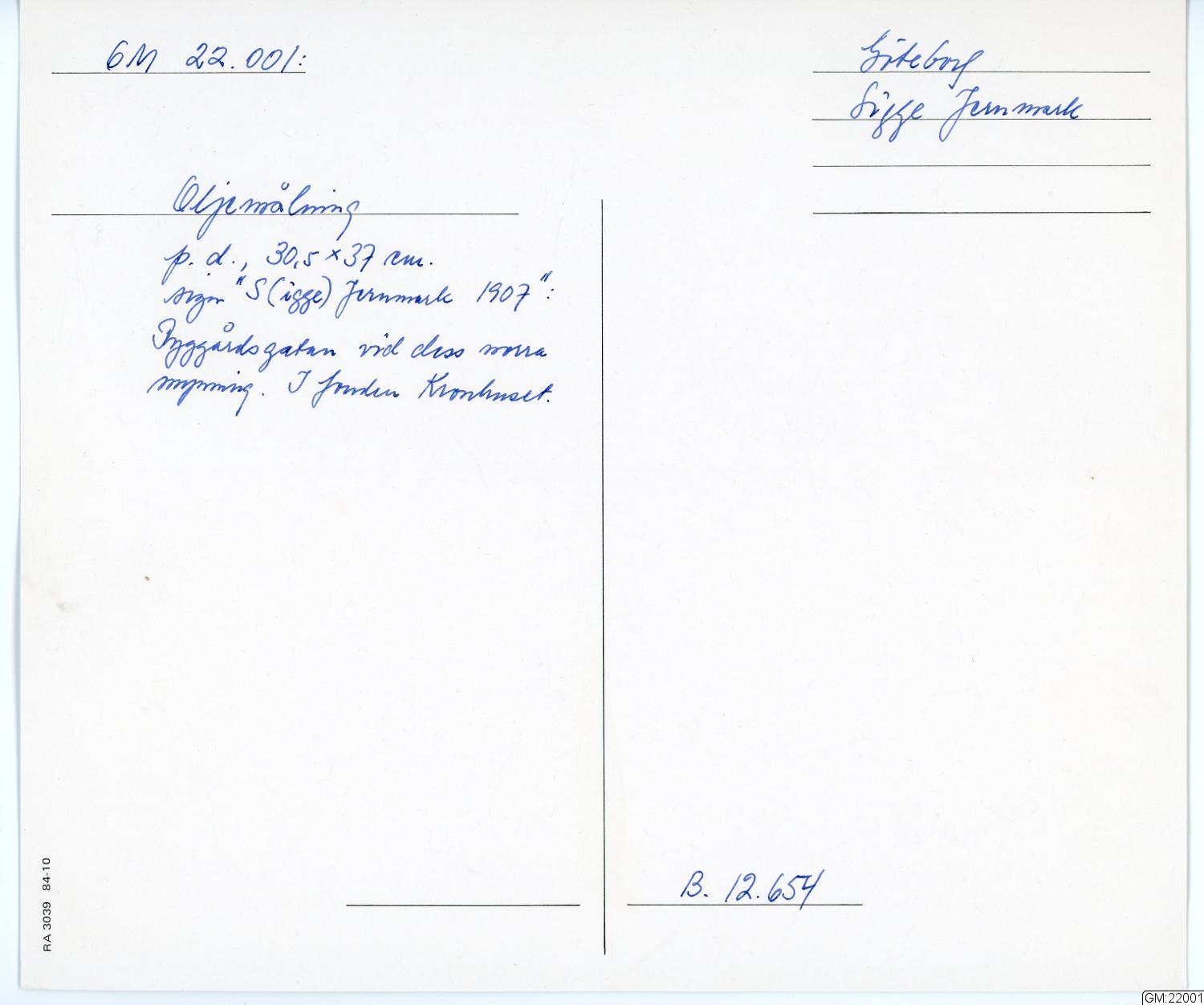 Sträckningsbild med Tyggårdsgatan mot norr, i fonden Kronhuset. På ömse sidor om gatan, till vänster, Göteborgs Museum och till höger Sahlgrenska-/Sparreska huset.
