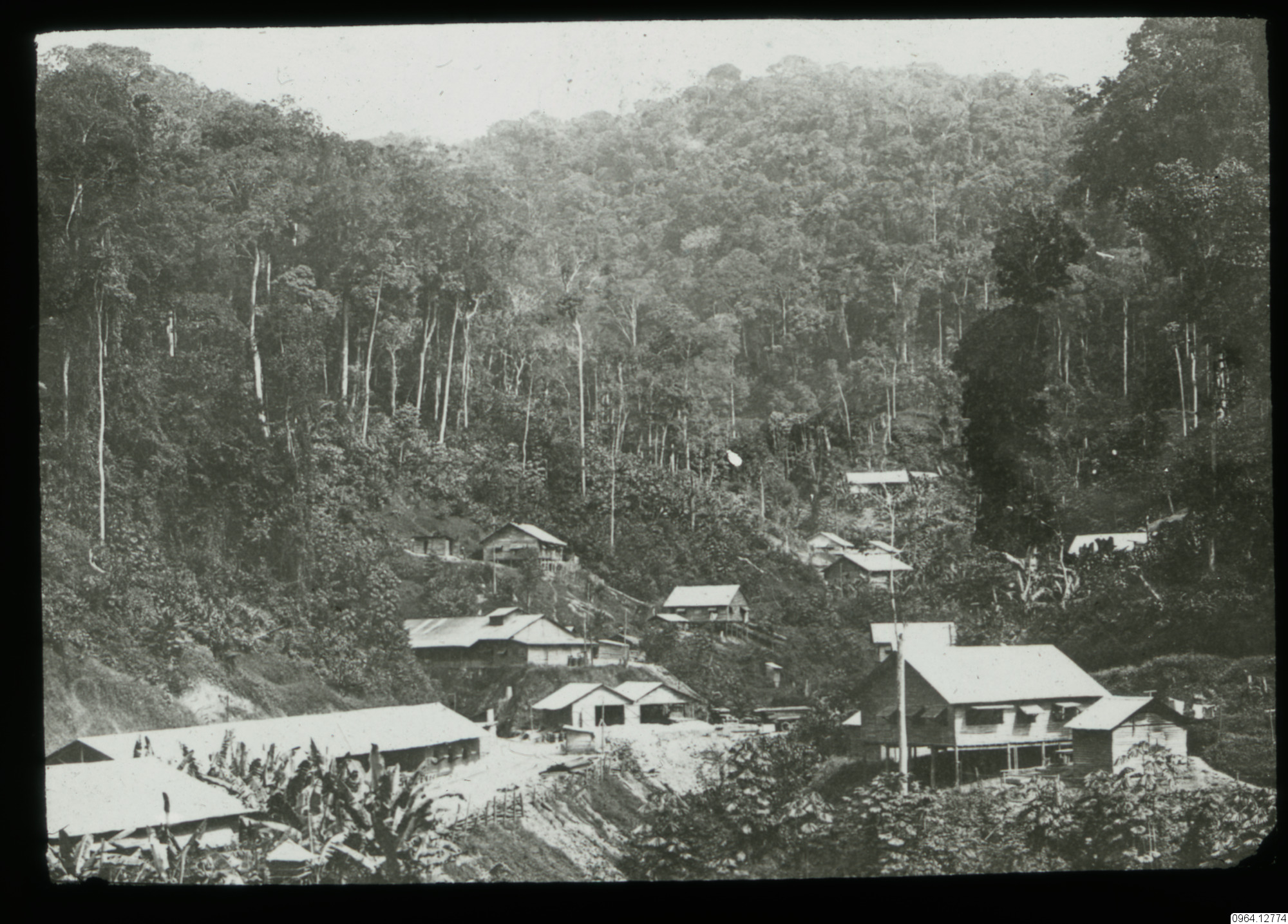Regnskog (djungel) och en by. Ett hus står på stolpar.