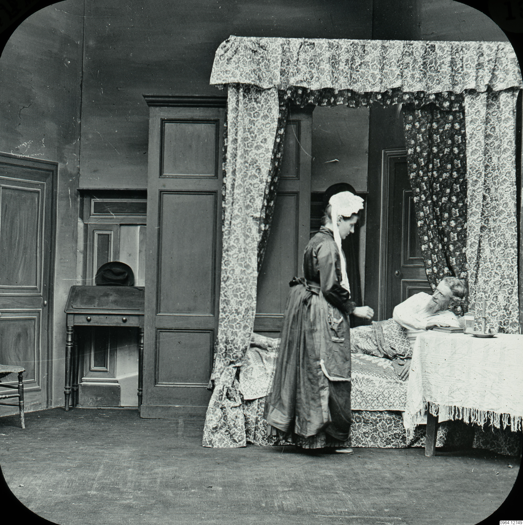 En kvinna som står vid säng och en som ligger. Enoch Arden by Tennyson.