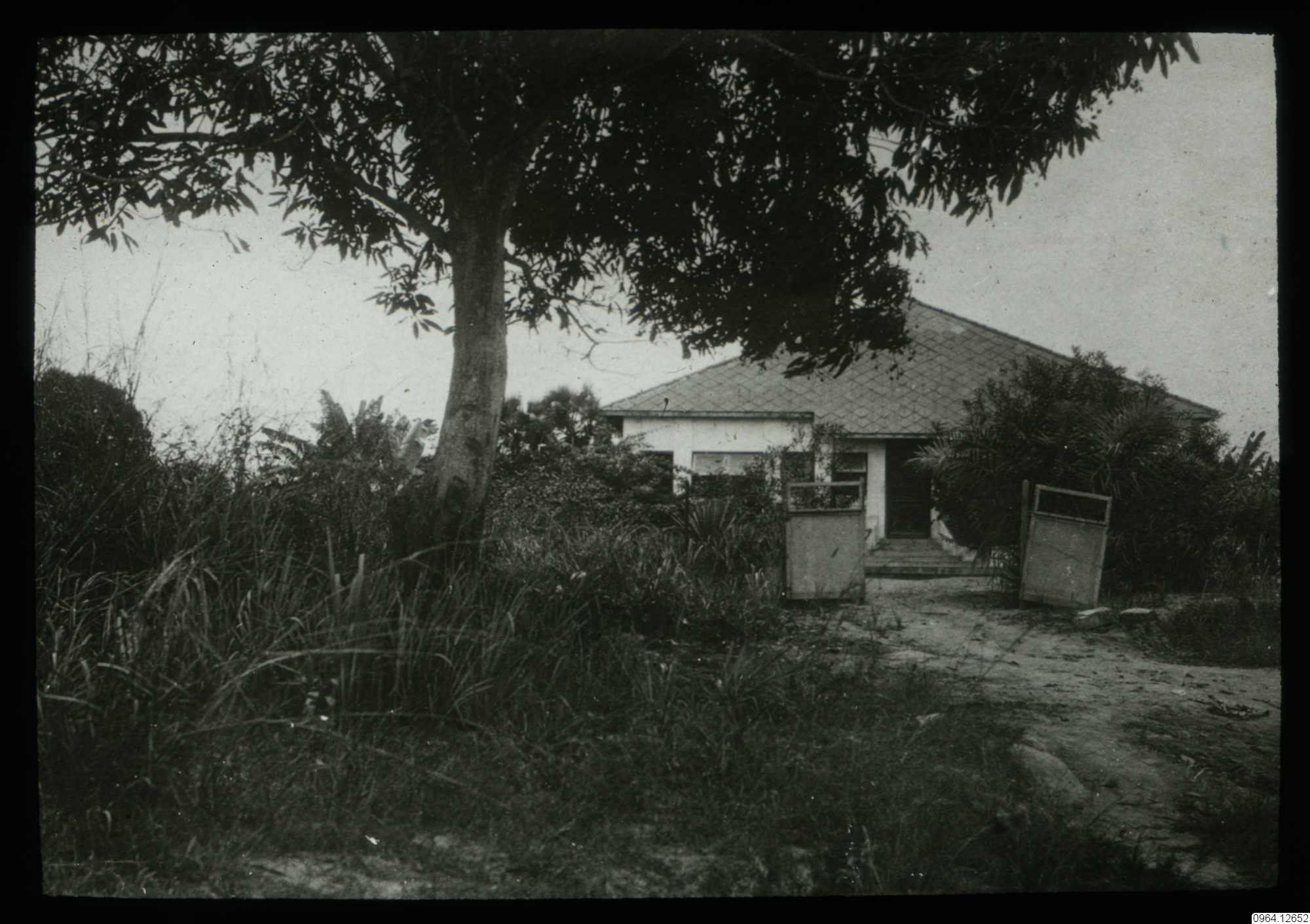 Ett förfallet hus. Grindarna sitter på sniskan.