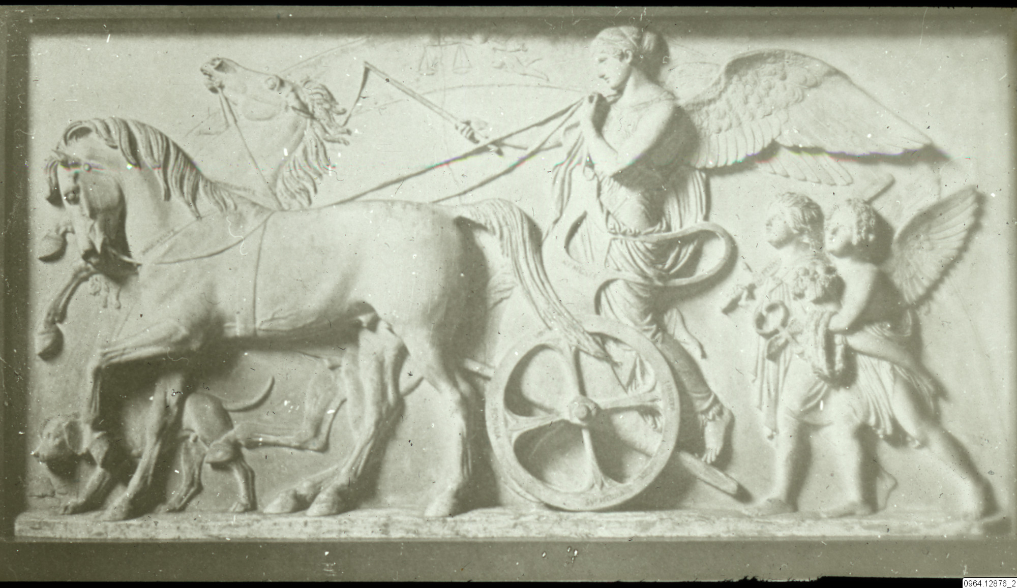 Fotografi av en gipsmodell av skulpturen Nemesis Attended by the Genii of Punishment and Reward av den danske skulptören Bertel Thorvaldsen.
