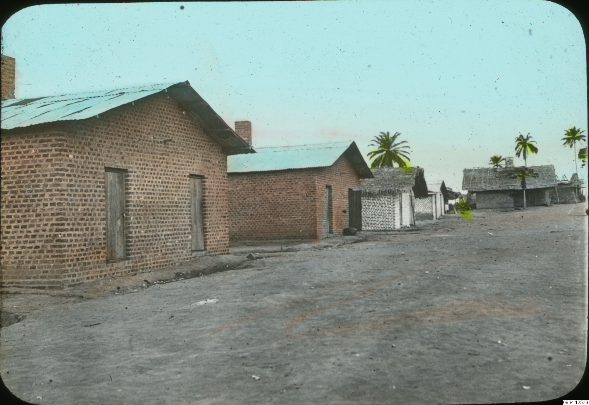Två tegelbyggnader med plåttak. Missionsstation eller by?