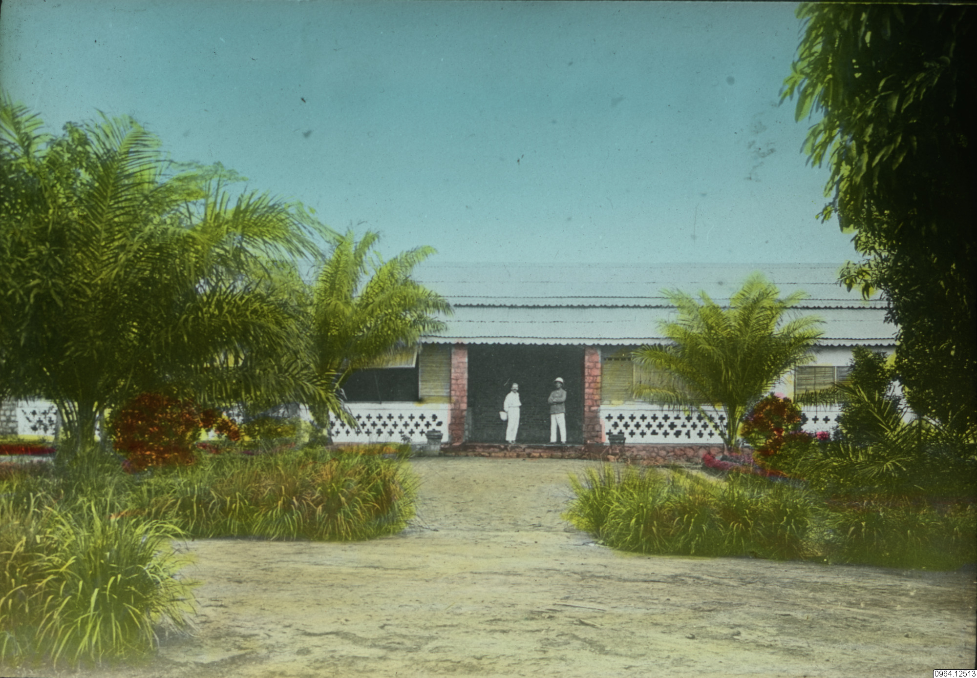 Statsport, två missonärer (?) utanför hus.