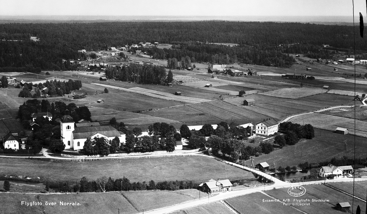 Norrala, Hälsingland. Den vita trevåningsbyggnaden är gamla skolan. Flygfoto över Norrala