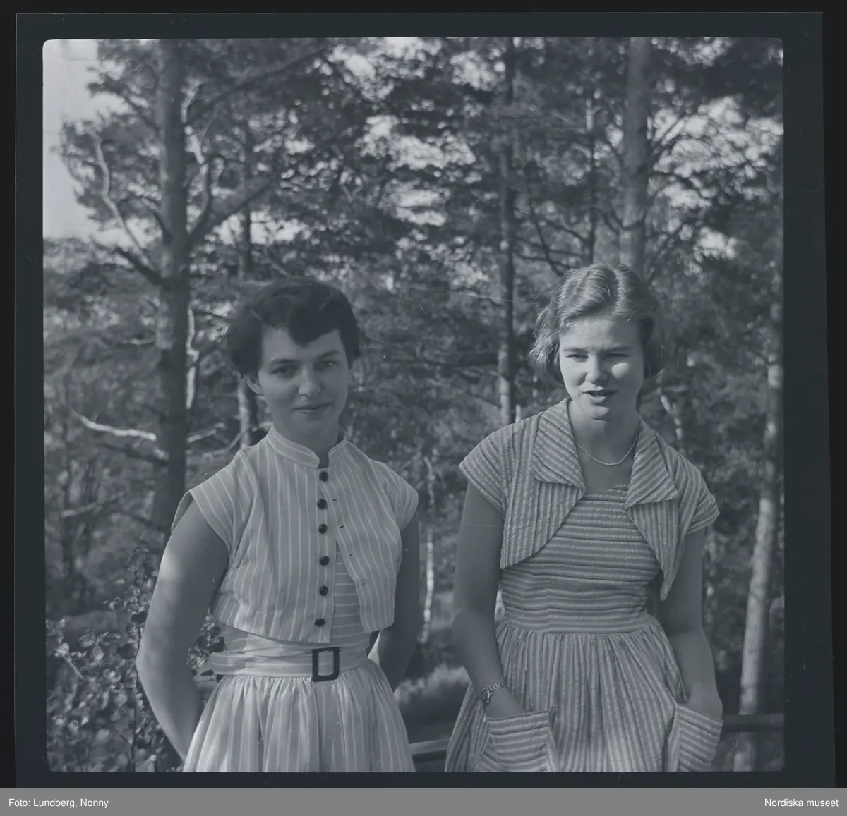 Två unga kvinnor, båda iklädda randiga klänningar.