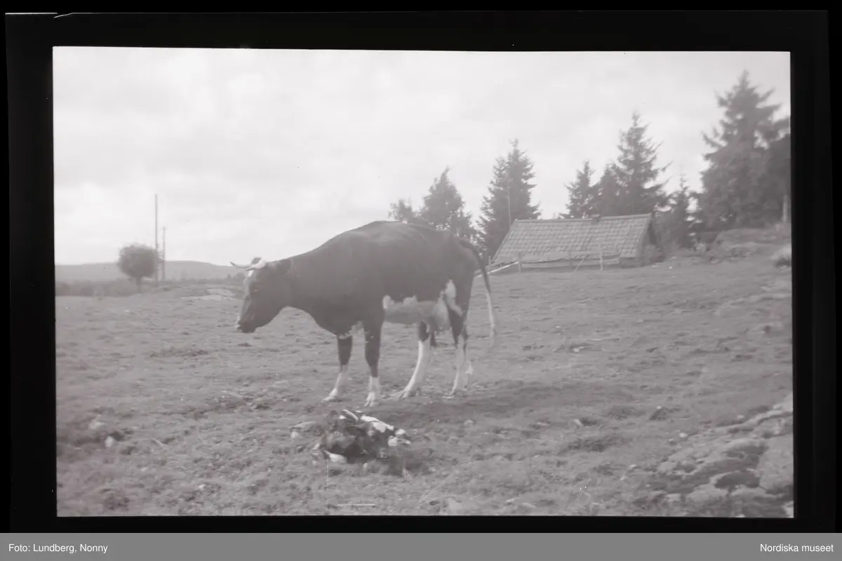 Ko med nyfödd kalv i hage.