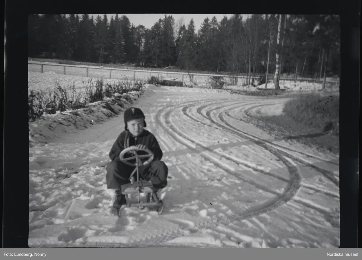 Ett barn på en kälke med ratt.