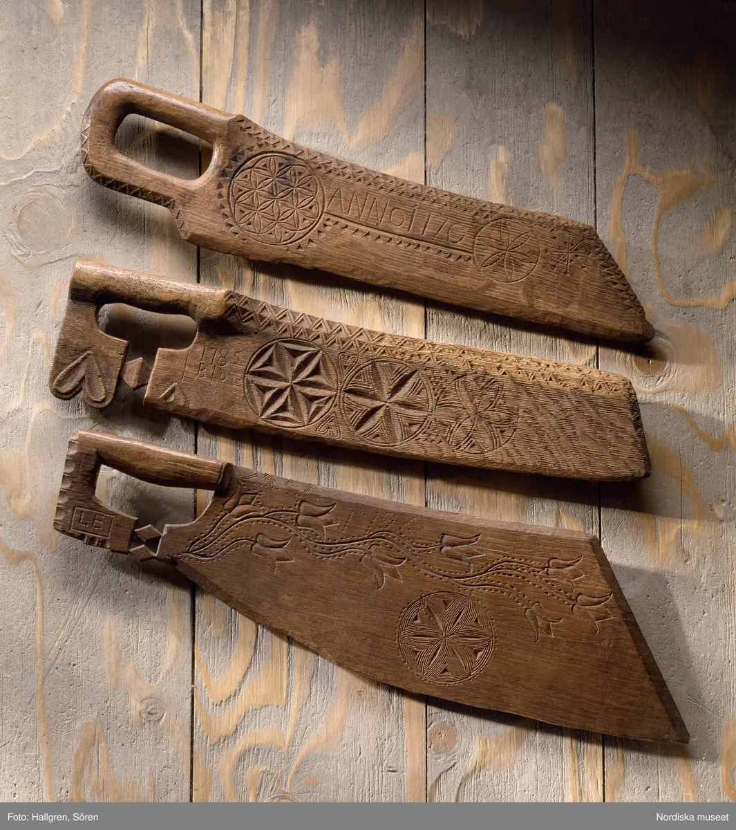 Tre skäkteträn (svingträn) från ovan NM.0025063, NM.0144234 och NM.0071770. Från Östergötland finns skäkteträn med karvsnitts- och knivsuddsornamentik. Materialet är oftast ek.