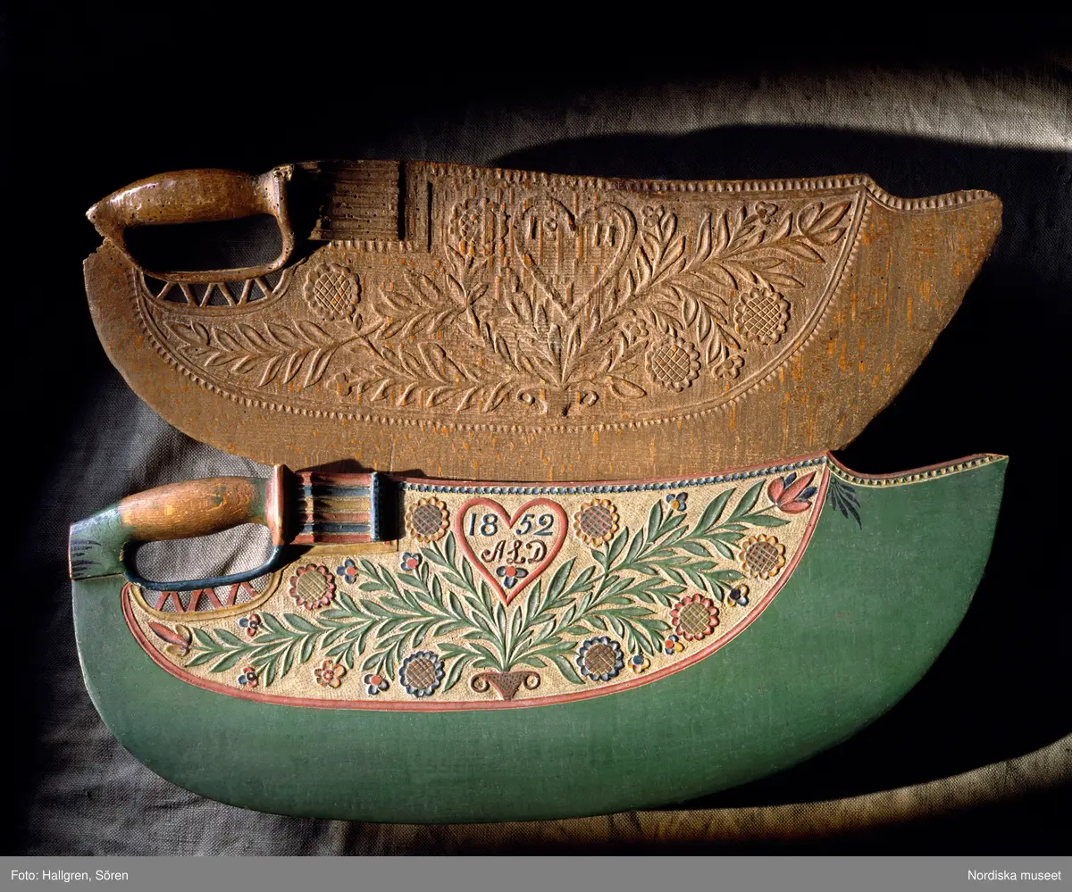 Två skäkteträn av bok från Österlen i Skåne. De är av bokträ med skuren dekor och datering, det ena rikt bemålat. NM.0185471 och NM.0135757.