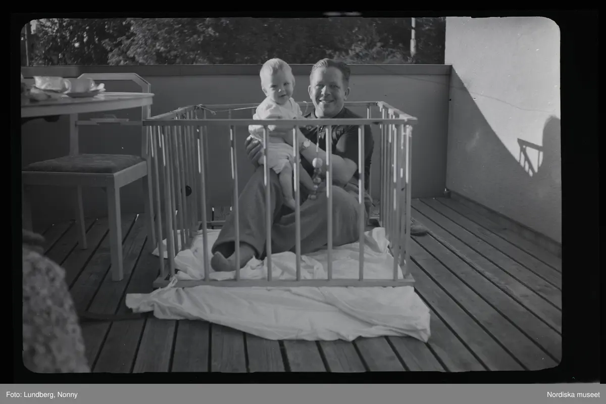 En pappa sitter tillsammans med sitt barn i en lekhage.
