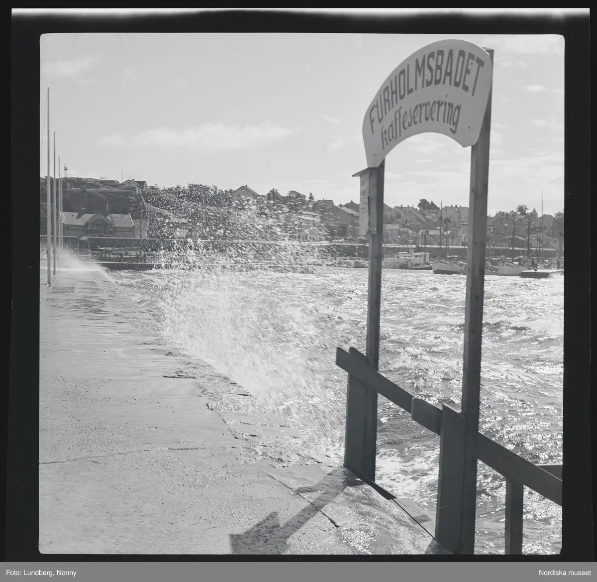 Vågor slår mot kajen vid Furuholmsbadets kaffeservering.