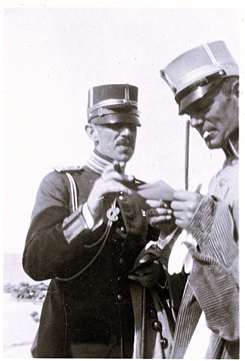 Foto av två män i uniform. Bildtext i album: "Här är dom!!! Nils-Erik och Ryttmästare von Krusenstjerna".