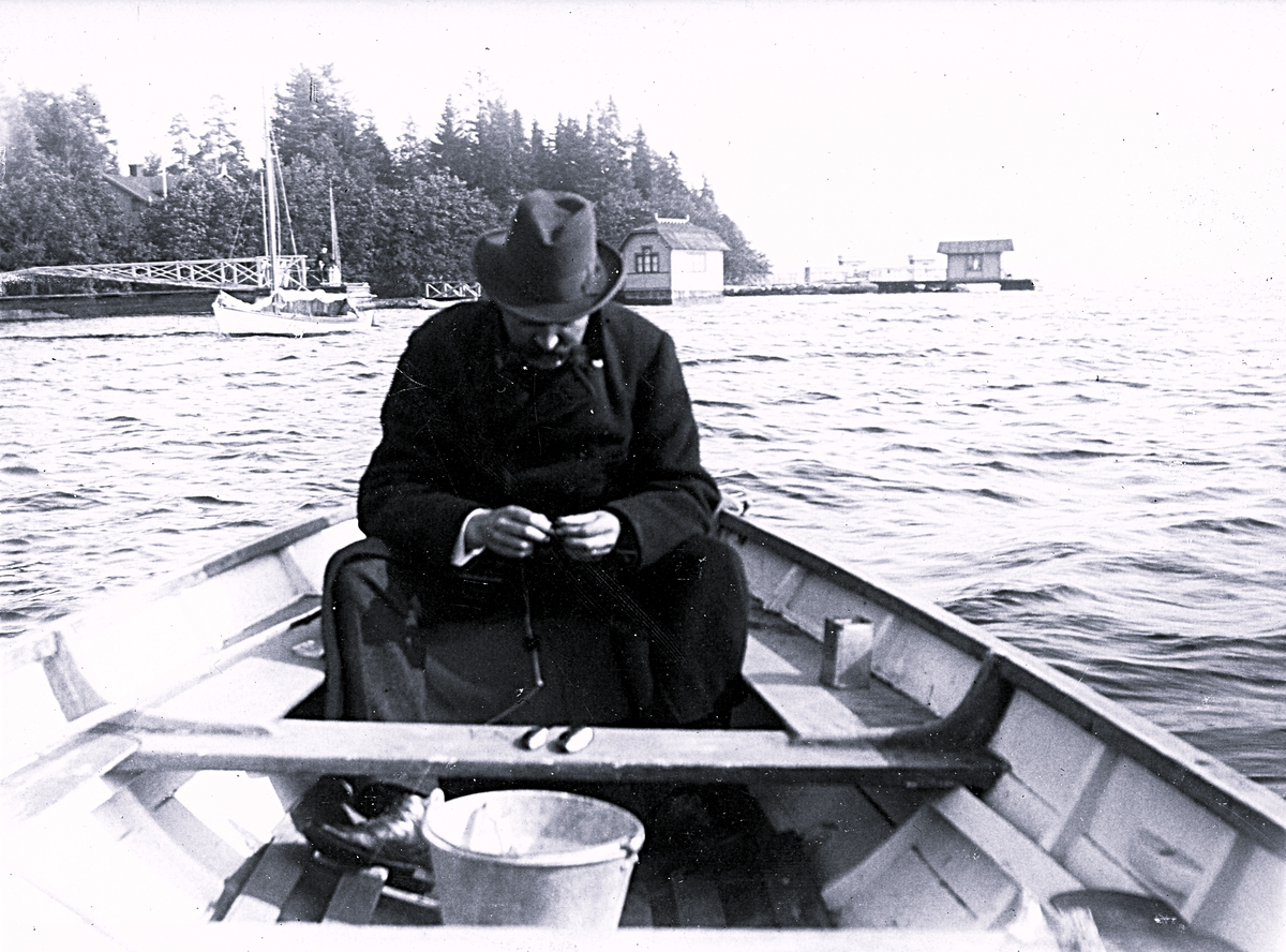 Foto av man i en eka. Bildtext i album: "Pappa på "stor"-fiske".