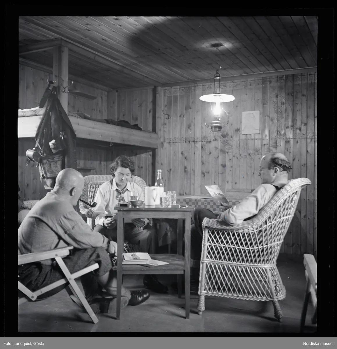 Victor von Feilitzen, Karin Rylander, Nils Frölander sitter i en fjällstuga.