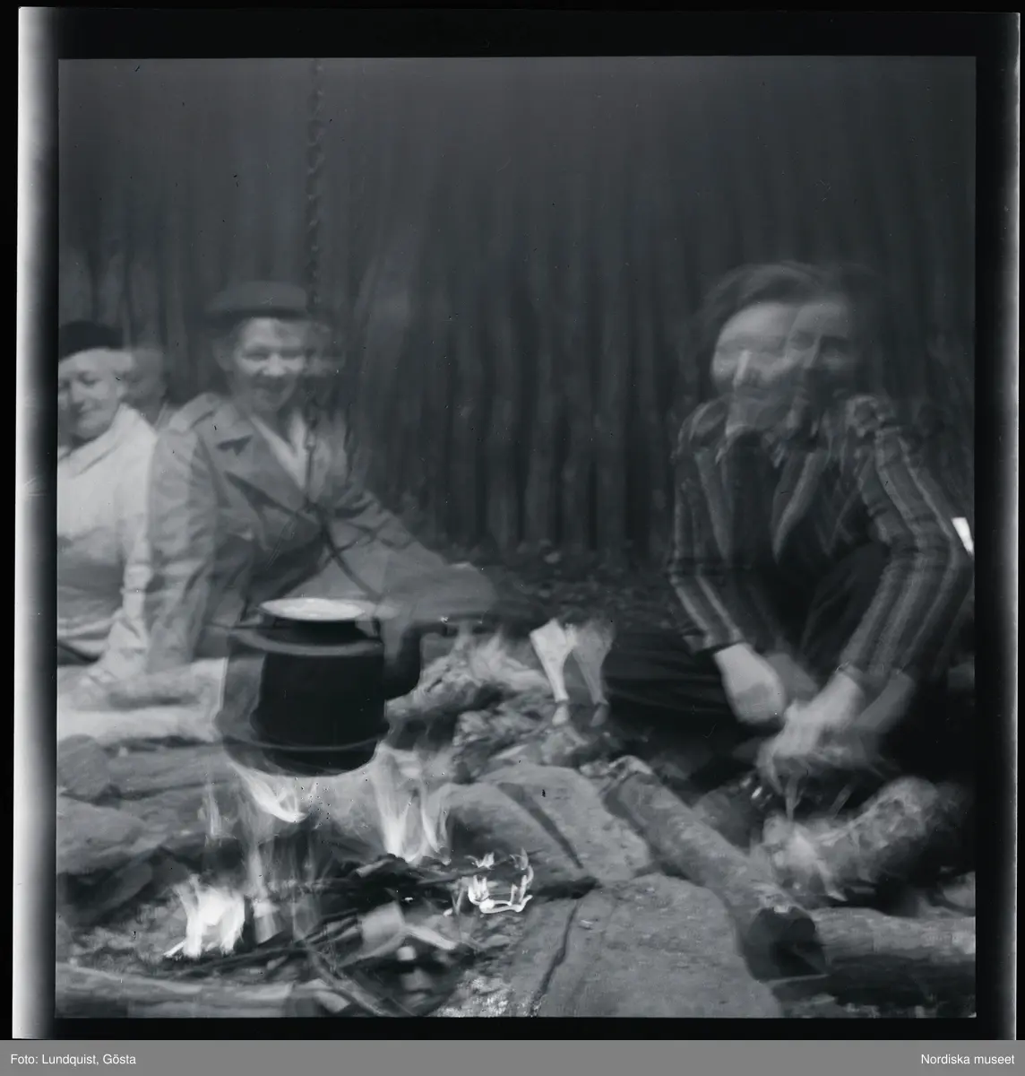 Tre kvinnor sitter runt eldstaden i en kåta.